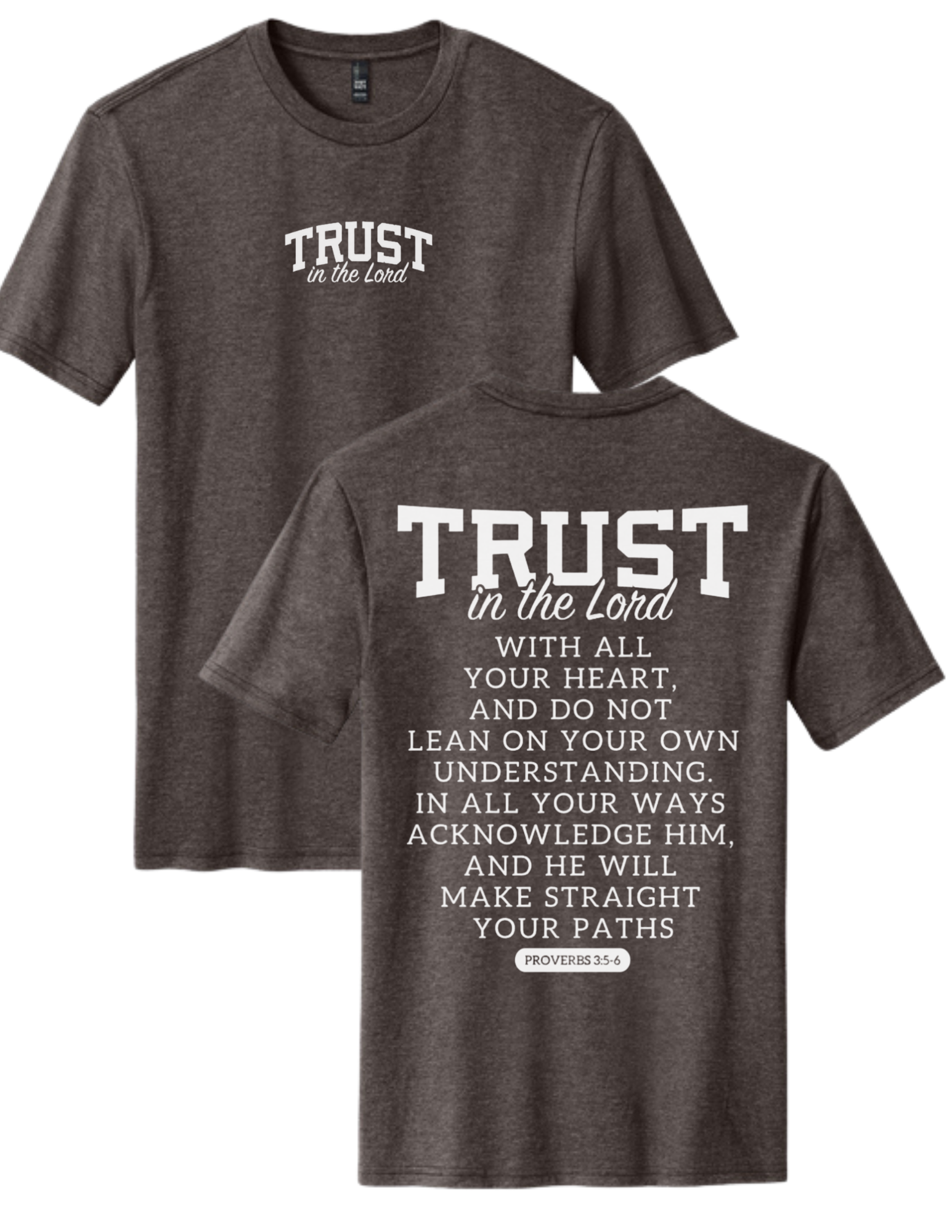 This tee features a meaningful two-sided design. On the front, a simple and encouraging “Trust in the Lord” graphic sets the tone. The back showcases a large, beautifully arranged print of Proverbs 3:5–6, a reminder to lean on God’s guidance in every season.